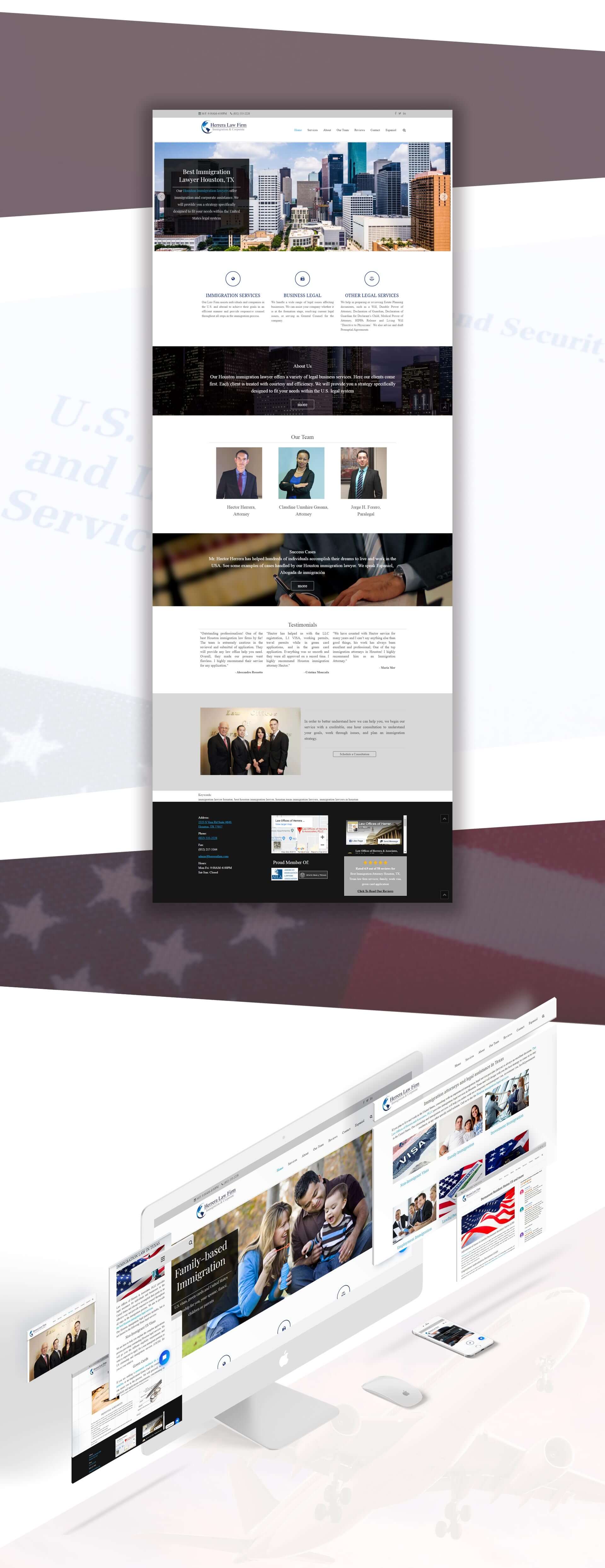 While working on Herrera Firm’s website, we focused on creating a professional web design with clearly expressed values of the company. We wanted to emphasize just how much experience, knowledge, and client trust Herrera Firm has. It was important to have a content-rich website so customers in need of legal services could access general information about what they needed. We created over 20 pages of new, engaging content. Because most clients are searching for services on their phones, we designed a fully responsive website with easy navigation and all information is readily available on every device. We made both English and Spanish versions of the website to ensure Spanish speaking clients understand the company’s values and services.